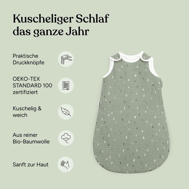 Ehrenkind® Muslin Baby Sleeping Bag 2.5 Tog | 100% Organic Cotton | Baby Sleeping Bag | Oeko Tex Certified, jade with drops