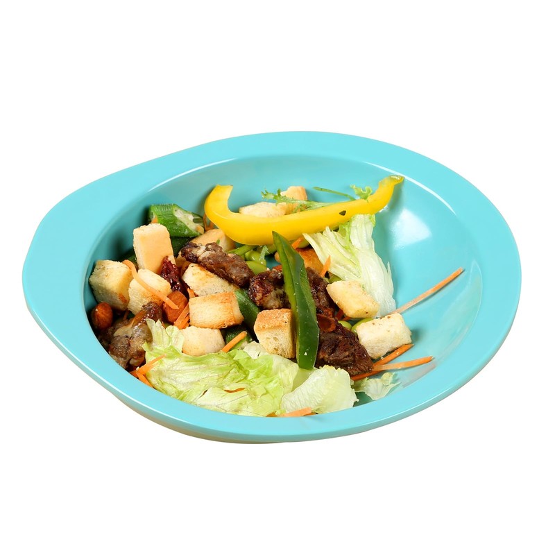 - [Curved trailing edge and Concave edge profile Design]:Ehucon adaptive utensil melamine serving dinner bowl has a unique concave edge contour profile section that helps the users scoop food to the raised side when the user has restrained movement of arthritic hands which can’t fine tune his grasp on the adaptive utensils spoon and fork. The weighted utensils for tremors and parkinsons patients adopts a curved trailing edge design to accommodate food and food can easily fall on adaptive eating utensils spoons or forks.