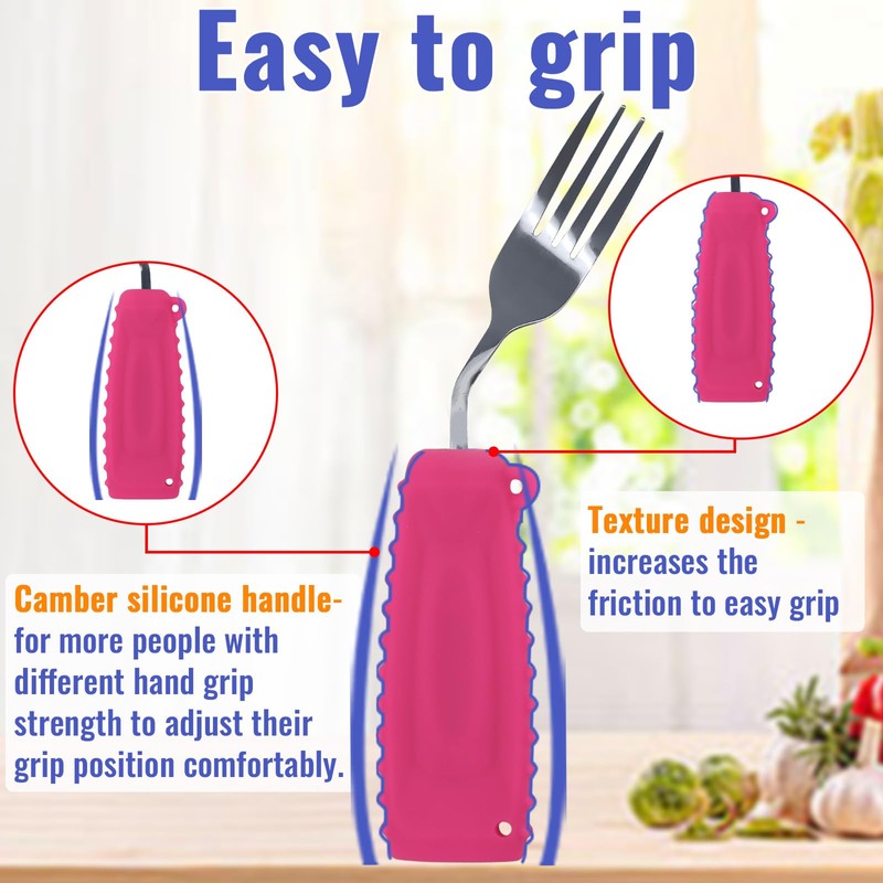 - 【Multiple colors】The handle of adaptive utensil for hand tremors is designed in various colors, aiming to stimulate appetite through bright colors. Providing you with adaptive angle built up utensils in purple, green, orange, and pink for your choice. Bright colors of the adaptive utensils make people feel happy and full of vitality, bringing a more positive dining experience for elderly.