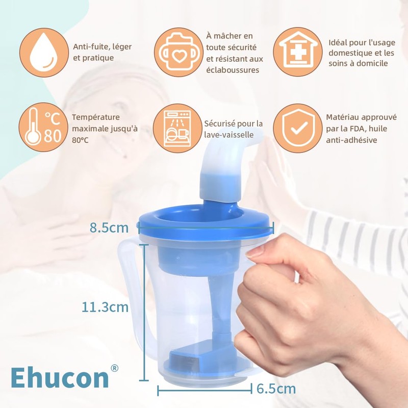 - Der Ehucon Becher mit begrenztem Durchfluss ist aus FDA-Materialien mit Skala und festem Griff hergestellt. Es ist für Benutzer gedacht, die keine verdickten Flüssigkeiten vertragen und nicht für die Verwendung mit leicht verdickten Flüssigkeiten geeignet sind.
