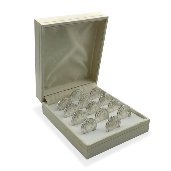 - ✅El juego de monedas arras para boda incluye 13 arras en baño de plata (diseños diferentes a elegir) y estuche.
