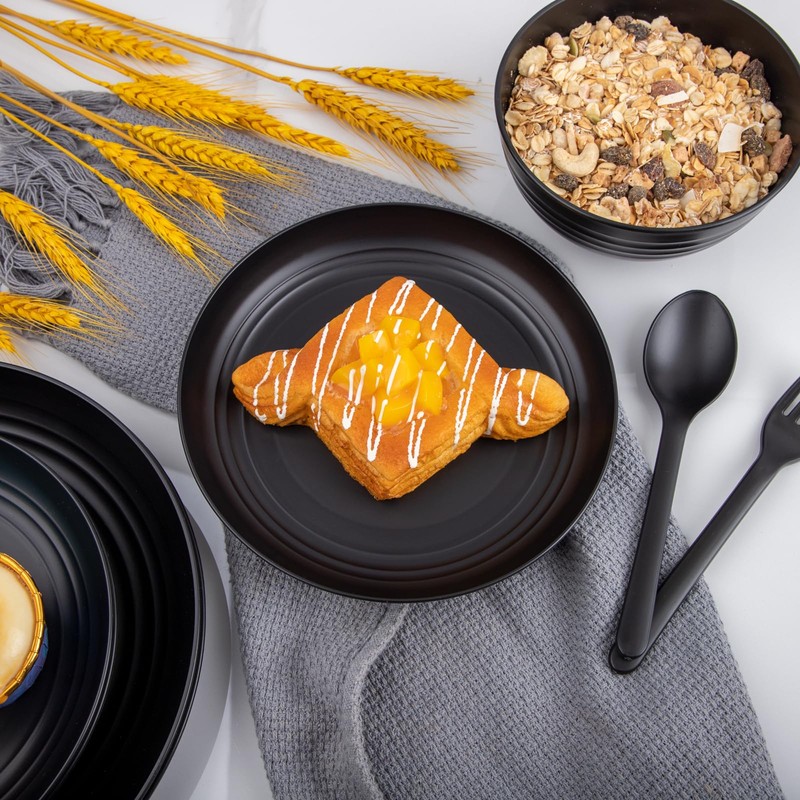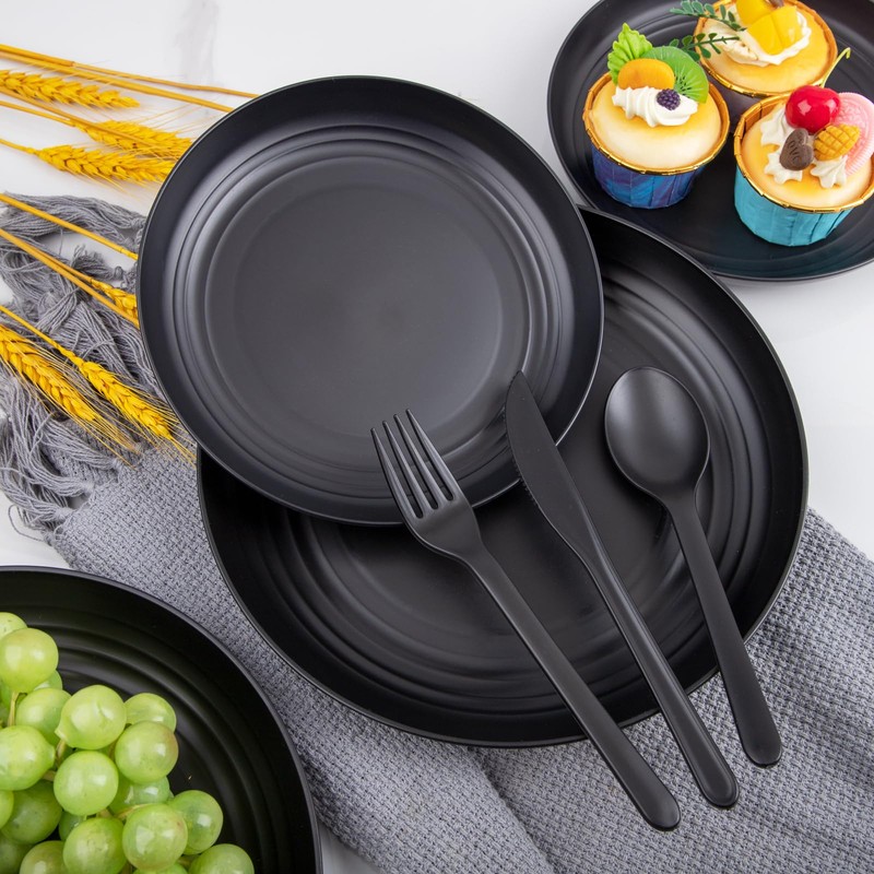 - Serves 6 Guest-Black wheat straw dinnerware set include 6pcs dinner plates,6pcs dessert plates,6pcs bowls,6pcs cups,6 forks,6 knives,6 spoons,Can cater for a small party of six people.
