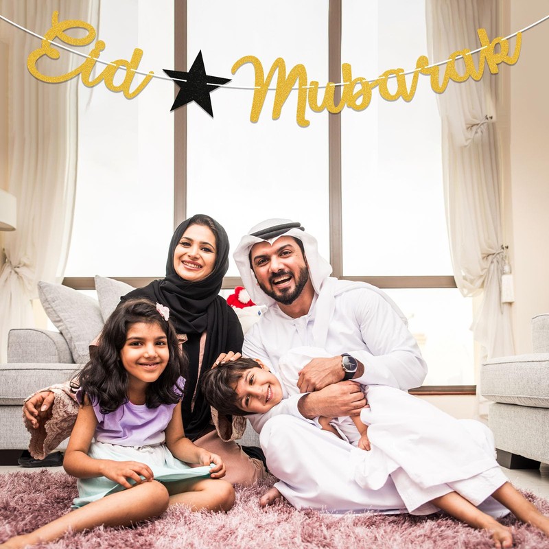 Eid Mubarak Banner with Star - Eid Festival Party Decorations, Ramadan Mubarak Banner, Happy Eid Decor, Ramadan Home Mantel Fireplace Decoration Gold Glitter