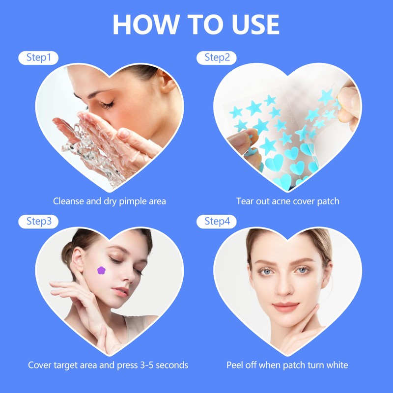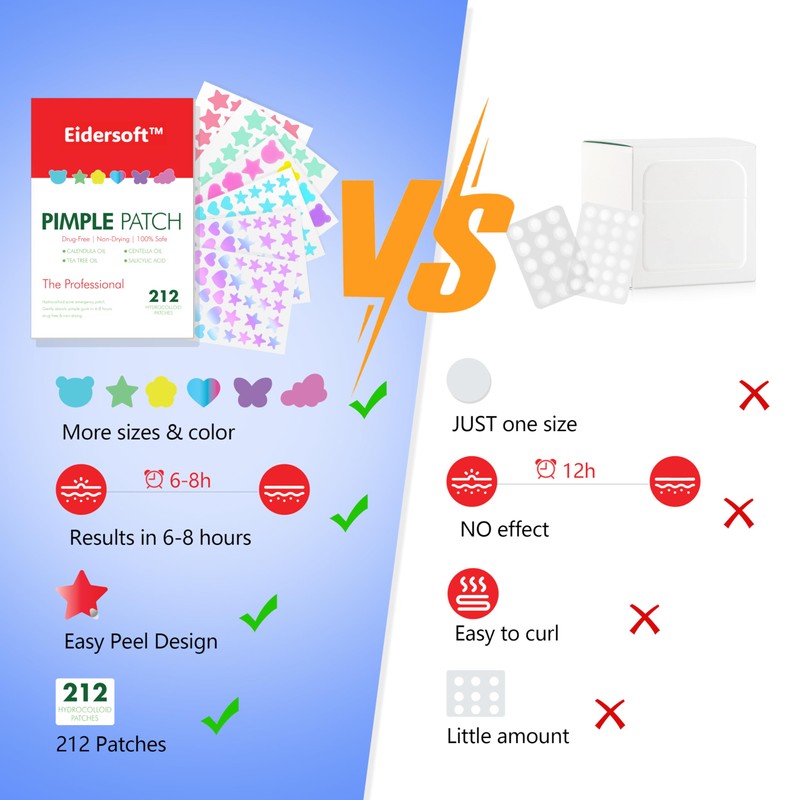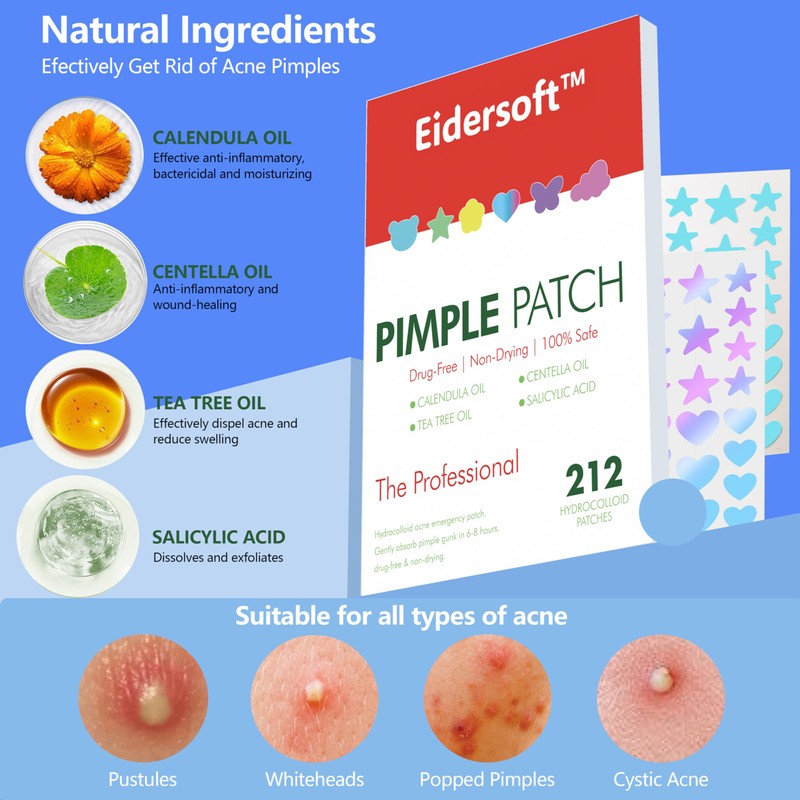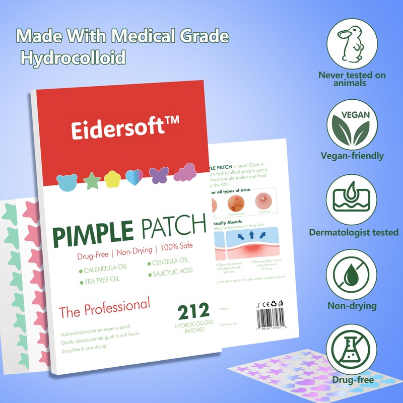 Available in various sizes and designs, including adorable star-shaped patches, Eidersoft face pimple patches cater to all skin types and acne severities. These zit stickers effectively absorb secretions and conceal acne on the face, while their cute appearances add a playful touch to your acne control routine.
