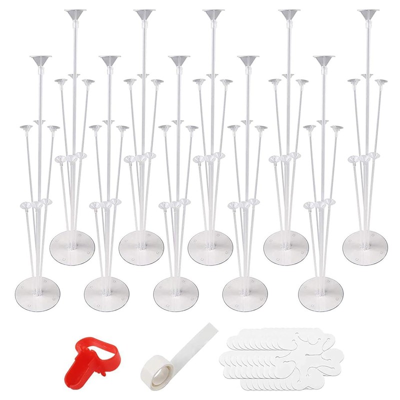 - KIT INCLUDES10 sets of balloon stand kits, 100 glue, 1 tie tool, 10 flower clips. Each balloon holder kit includes 15 tubes (4 of which are tube joints), 7 cups and 1 base. (balloons are not included)