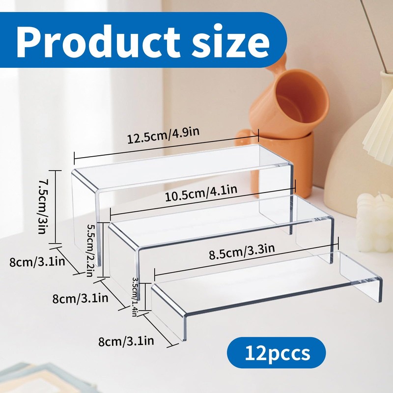 - 【ACRYLIC DISPLAY RISER】 - Our set includes 12 acrylic display risers in three sizes: four large (8 x 12.5 x 7.5 cm / 3.1 x 4.9 x 3 inches), four medium (8 x 10.5 x 5.5 cm / 3.1 x 4.1 x 2.2 inches), and four small (8 x 8.5 x 3.5 cm / 3.1 x 3.3 x 1.4 inches). These varying dimensions cater to displaying a range of items and can be used in diverse locations.