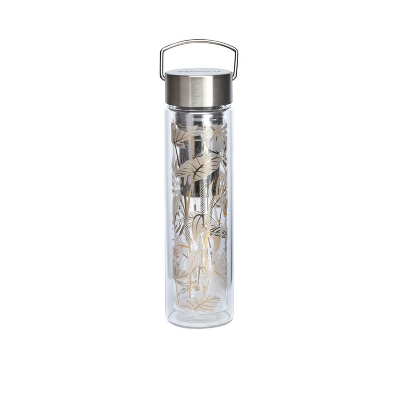 - Double-walled tea maker made of glass including stainless steel lid with carry handle and thermal jacket