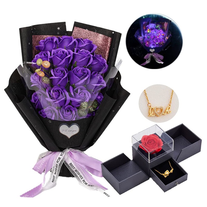 Wedding GiftsThis gift set is well arranged with a bunch of 18 PCS purple roses and preserved fake roses flowers and a fashionable LOVE gold necklace