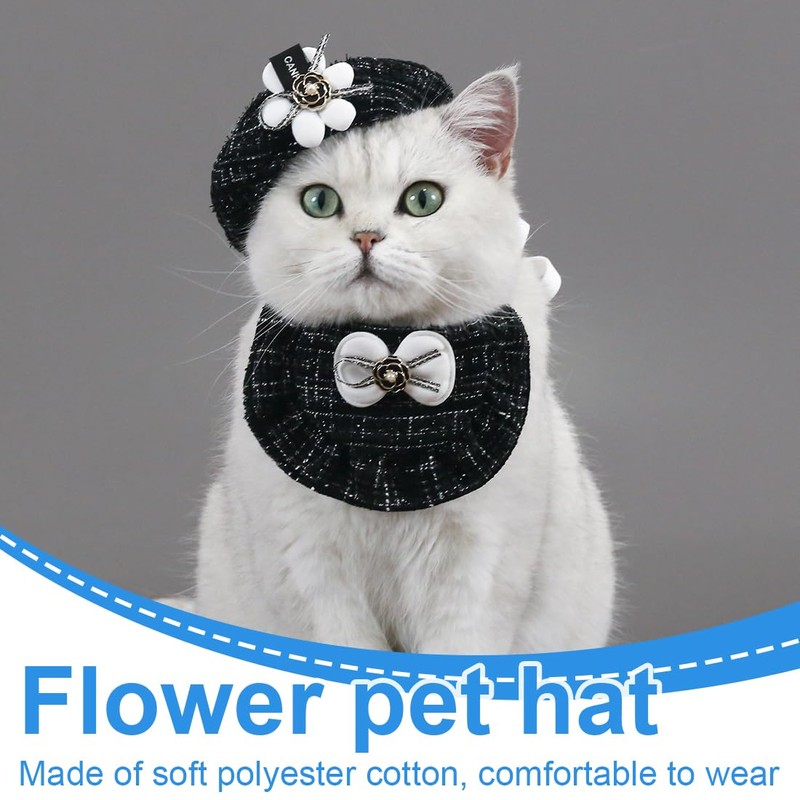 EIHI 1 Piece Black Beret Hat, Cat Hat, Cat Clothing, Costume for Cats, Dog Costume, with Flowers Headpiece for Cats, Puppies, Pet Materials