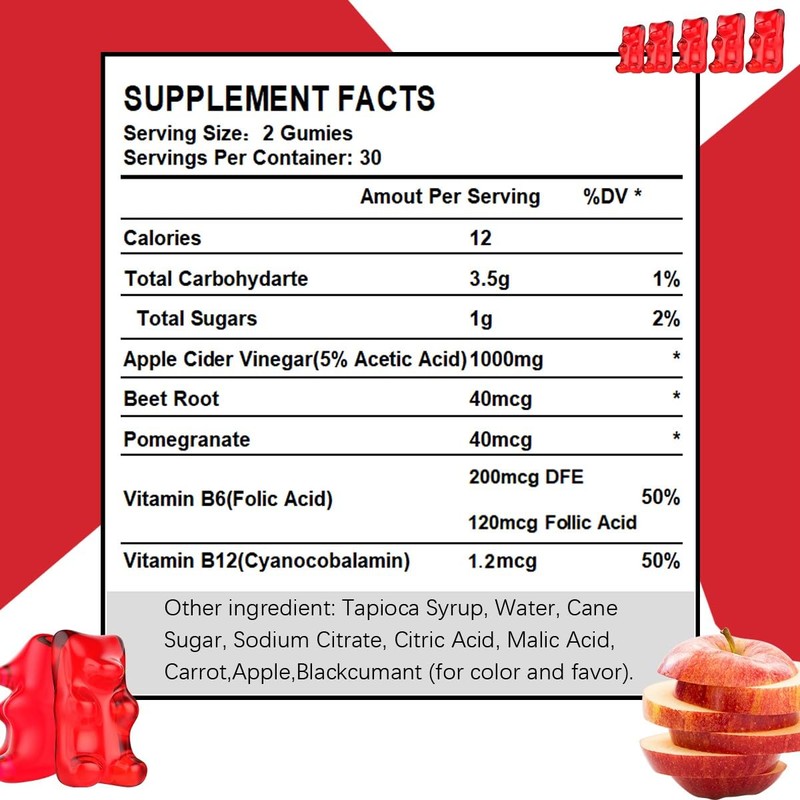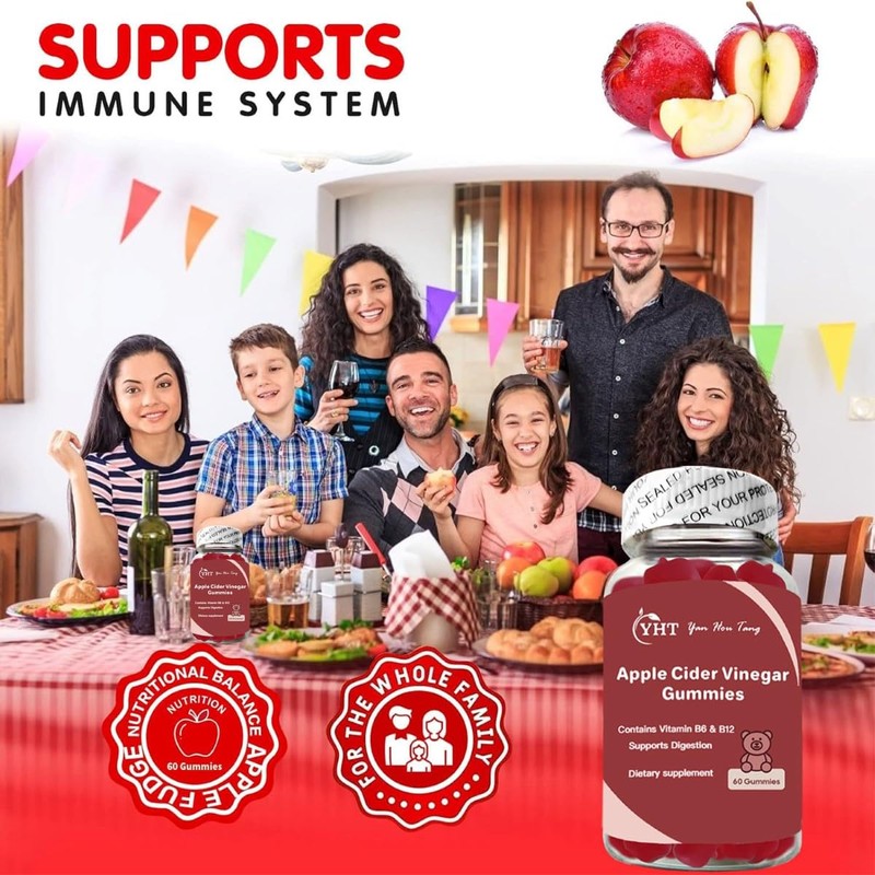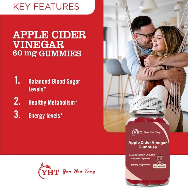 EILIN YHT Apple Cider Vinegar Gummies ACV 1000MG Vitamin B6 B12 60 Counts