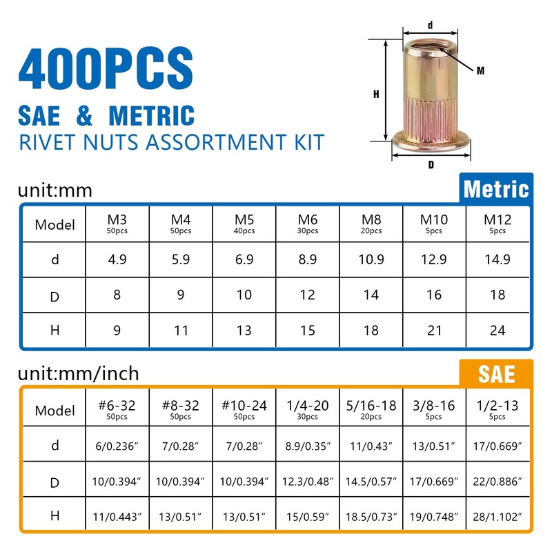 • 【Package Includes】: This rivet nut tool set contains 200 SAE and 200 metric nuts with separate boxes, common sizes, #6-32, #8-32, #10- 24, 1/4" -20, 5/16"-18, 3/8"-16, 1/2"-13, M3, M4, M5, M6, M8, M10 and M12