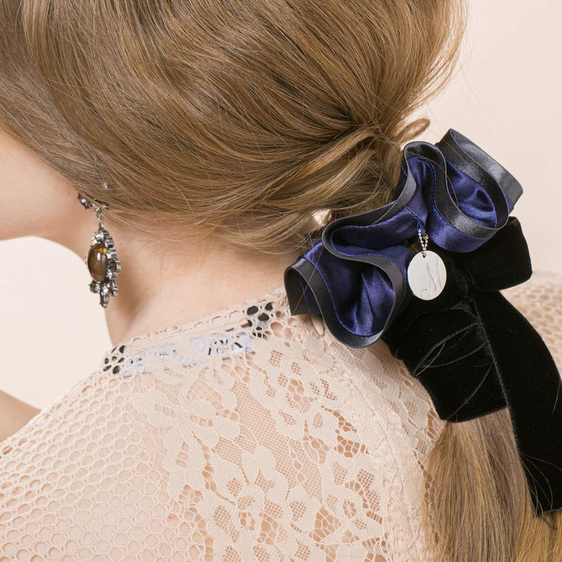 EILY ILY [Floral Gift Box Included] Limited Bi-Color Satin Scrunchie (Royal Navy) with Initial Charm, Silver Plate, Polyester