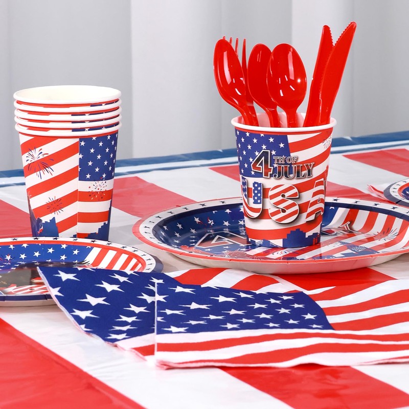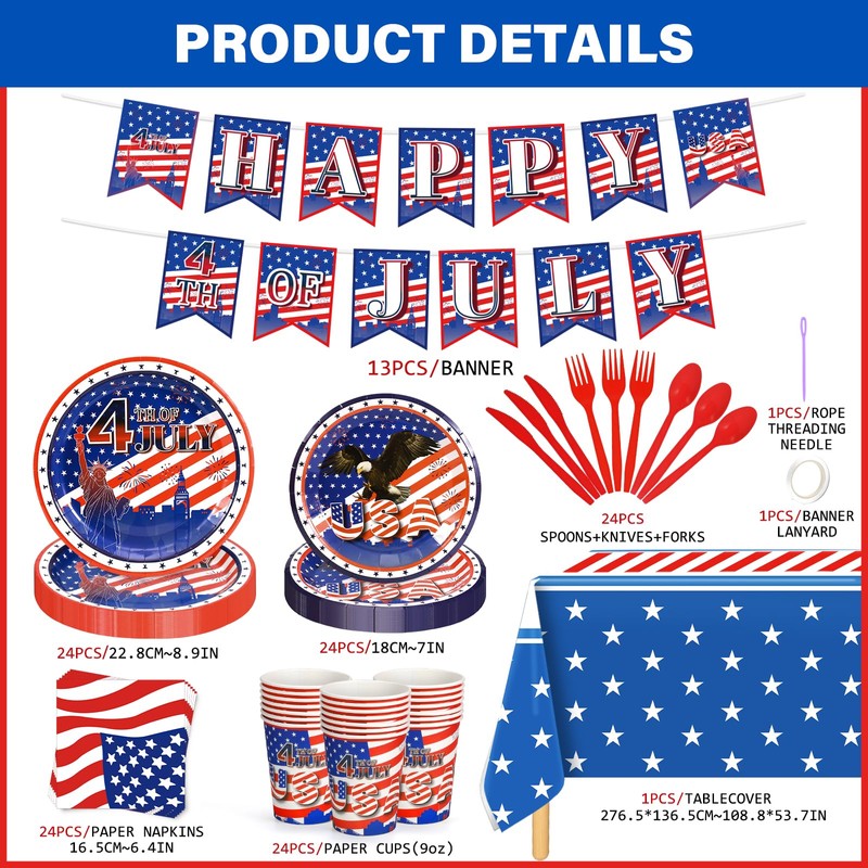 - 4th of July Table Decorations Supplies: The 4th of July party decorations set includes 24 pieces 4th of July of 9'' plates, 24 pieces of 7'' plates, 24 Memorial Day party napkins of 6.5’’, and 24 plastic red forks, 24 x red spoon, 24 x red knives, 24 American Flag and eagle paper cups, 1 pack tablecloth, 1 x fourth of July banner, 1 pack banner lanyard, and 1 pack rope threading needle. The American themed party decorations can serve up to 24 guests, a great choice for patriotic party supplies, fourth of July decor party, memorial day decorations, American flag decorations.