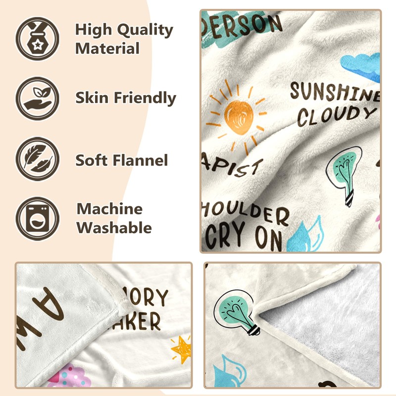 - Grandma Gifts: Adorned with cute labels like “MEMORY MAKER”, “SECRET KEEPER”, and “BEST FRIEND”, this blanket turns grandma irreplaceable roles into a cozy, visual love letter. Every doodle screams, “You’re the heart of our family!”