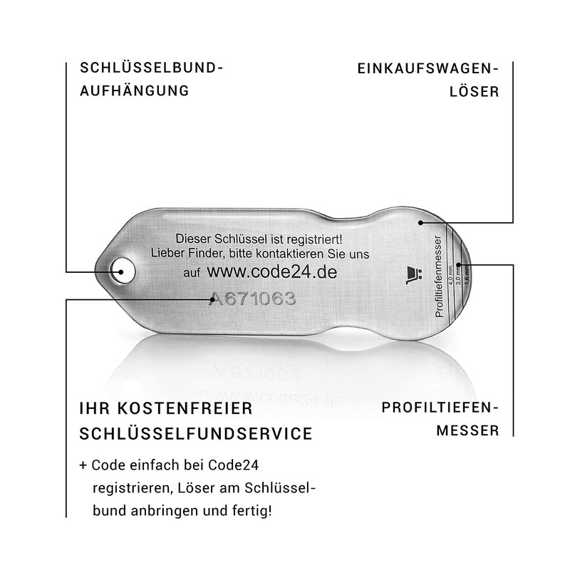In addition, the key ring is equipped with a key protector. If a lost key is found with this tag, the finder can report the find on .de and you will be informed immediately. Each pendant has an individual code. To ensure its longevity, the pendant is made of high-quality stainless steel and covered with a protective layer of epoxy resin against scratching or abrasion.
