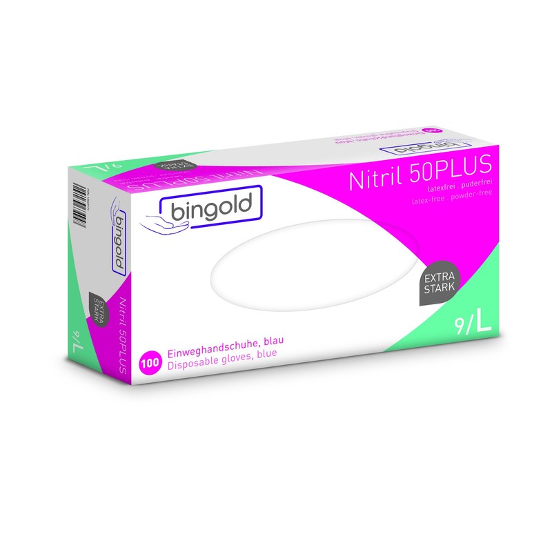- The BINGOLD nitrile 50PLUS disposable gloves are extra strong thanks to higher wall thickness and 240 mm long