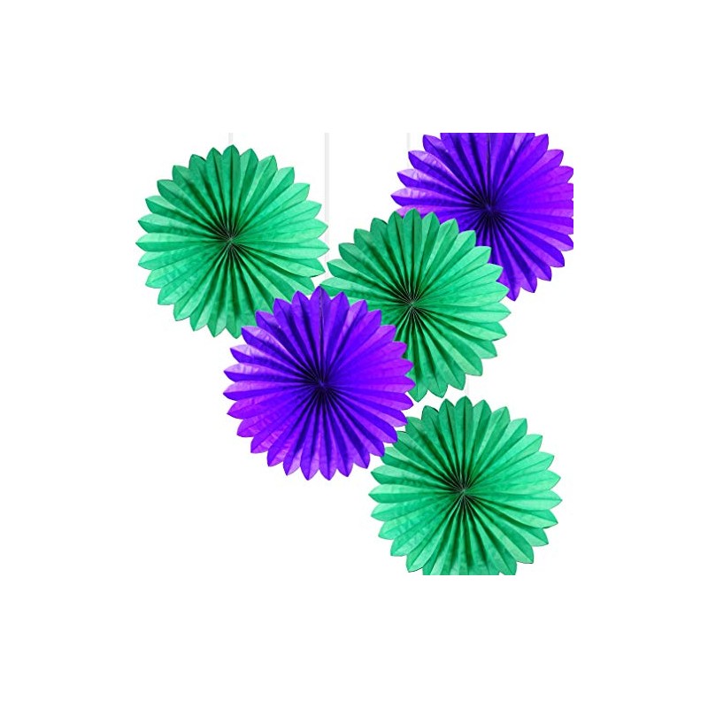 - Pack of 5 paper fans room decoration exclusively from EinsSein. Decorative rosettes in dimensions: 22 x 10 x 3 cm. Festive party decoration for wedding, christening, birthday. Decorative fan jade dream mix 37-40 cm light green purple