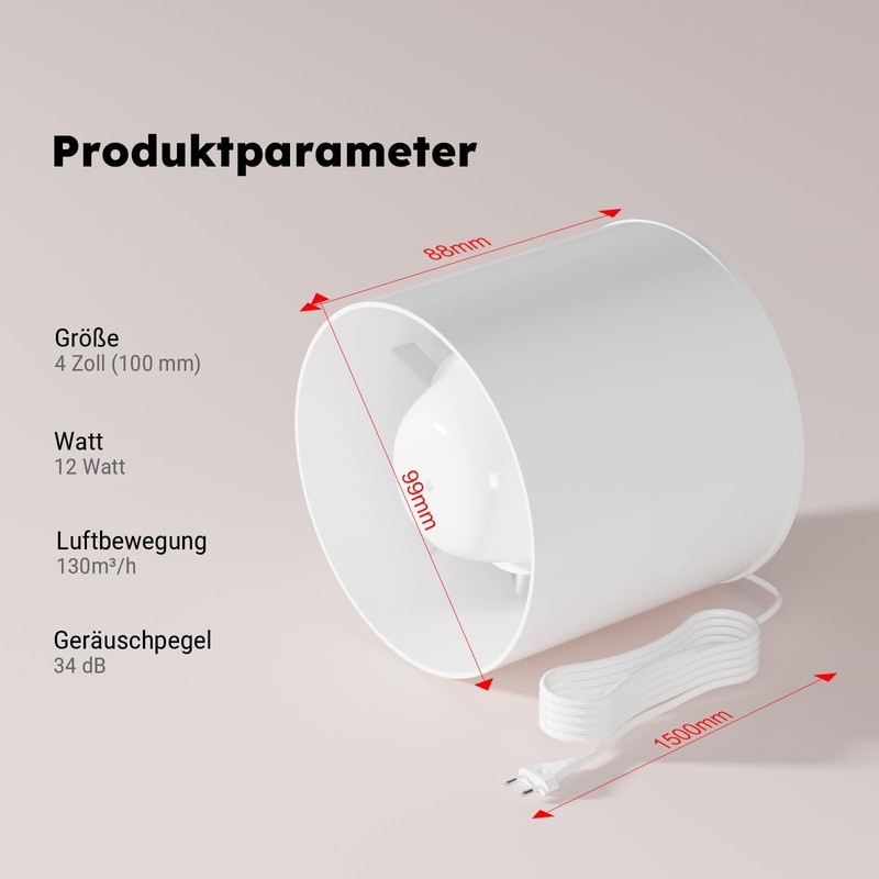 EINTTAX 100 mm Pipe Fan, Inline Extractor Fan, Quiet Pipe Fan 130 m³/h, Duct Fan for Bathroom, Toilet, Kitchen, Greenhouse, Tent, Garage, White (4 Inch (with 1.5 m Plug)