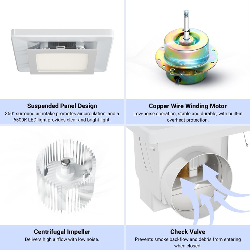 - Sturdy & Durable Material: This bathroom vent fan with light is made of high-quality ABS and PP materials, which are moisture-resistant, impact-resistant, rust-proof, lightweight and durable. It features a built-in overheat protection device that automatically cuts off the power when the motor overheats, making it safe, reliable, and with a long lifespan. In Addition, the check valve prevents air backflow and the entry of debris into the room when closed