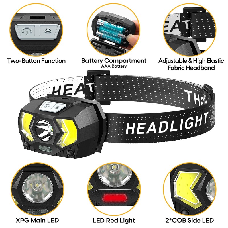 - 7 Lighting Modes: This headlamp battery powered has 7 lighting modes to meet your various needs.Power Button ①: Side Light High;Side Light Medium;Red Light On;Red Light Flash.Power Button ②:Main Light High;Main Light Medium;Main Light Flash.
