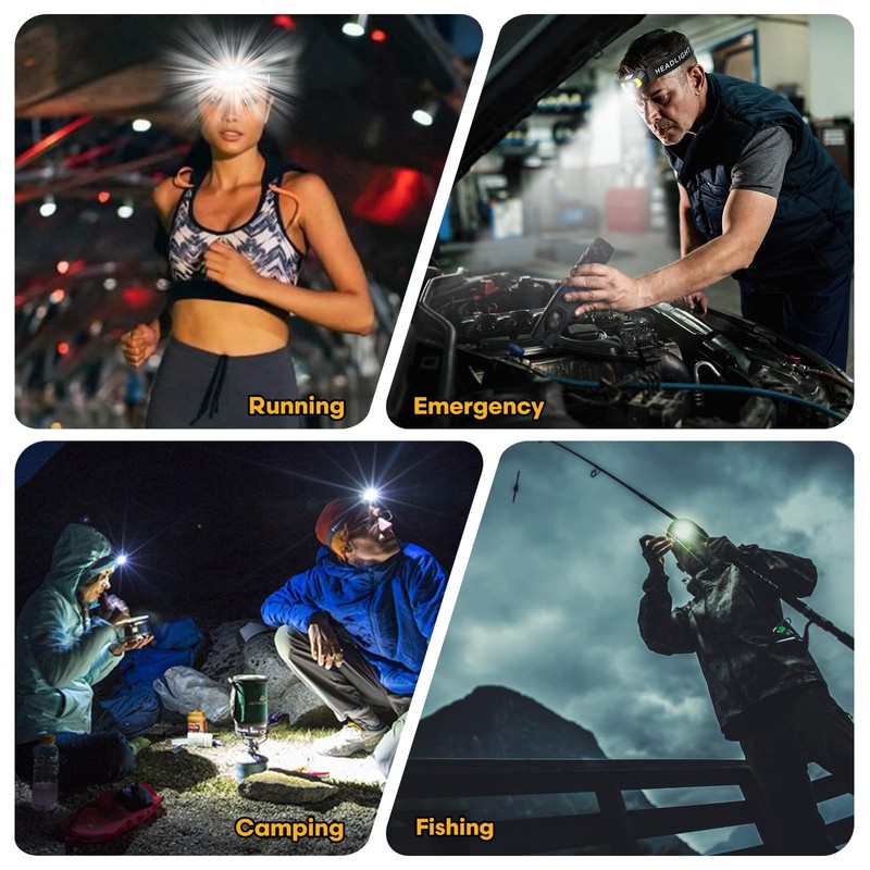 - IPX5 Waterproof: The head flashlight has IPX5 waterproof rated.The sophisticated design allows our headlamps to withstand splashing water from all directions without damage,keeping working in even heavy rain and other severe weather. Ideal for camping, running, hiking,fishing and other outdoor activities.