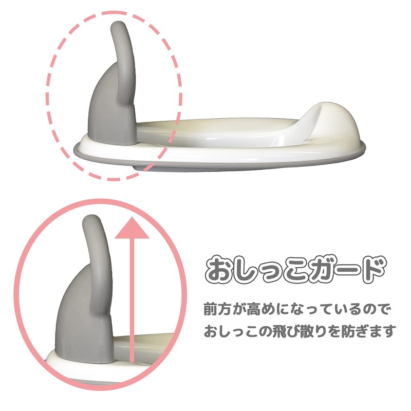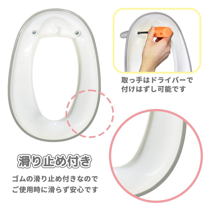 - Potty training auxiliary toilet seat for transition to adult toilet. It has a handle for stability and peace of mind
