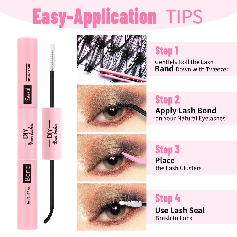 Easy-Application Tips: 1.gentlely roll the lash BAND down with TWEEZER 2.apply lash BOND on your natural eyelashes 3.place the lash clusters underneath your lashes 4.use lash SEAL brush to Lock. Risk-Free Purchase: Strong technical strength and perfect customer service system are assured to guarantee the purchase and usage.