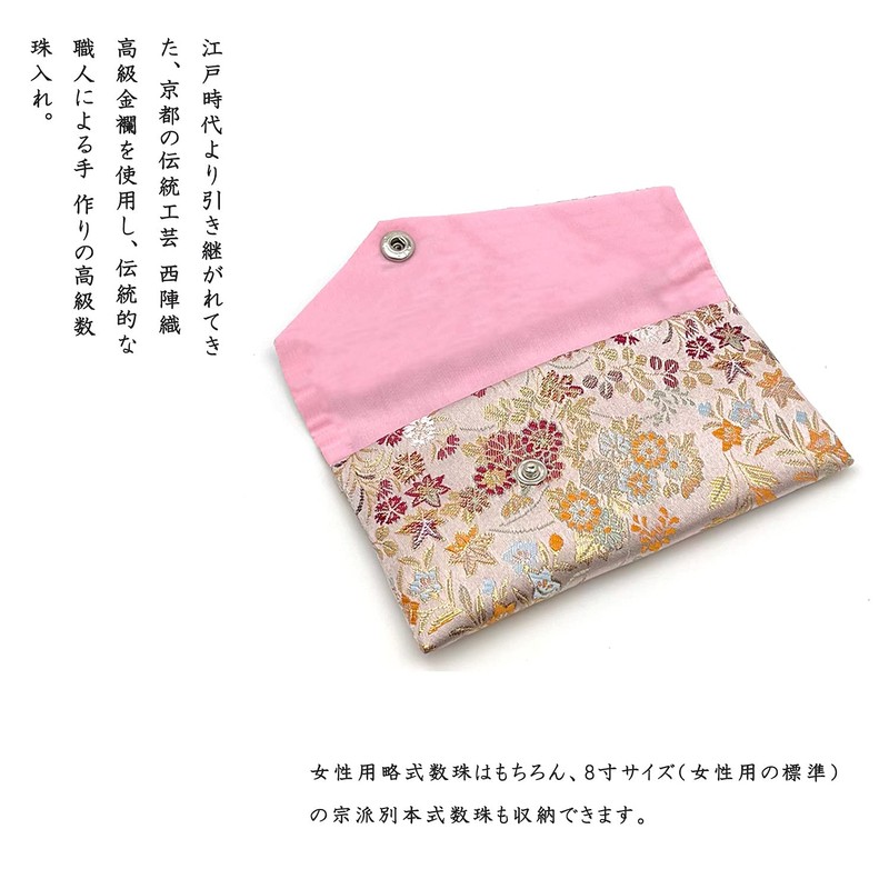 - (Features of Prayer Beads Bag): The soft and elegant pattern is lovely gold brocade (kinan). Nishijin woven mala beads on a pale colored plum chrysanthemum and grass background