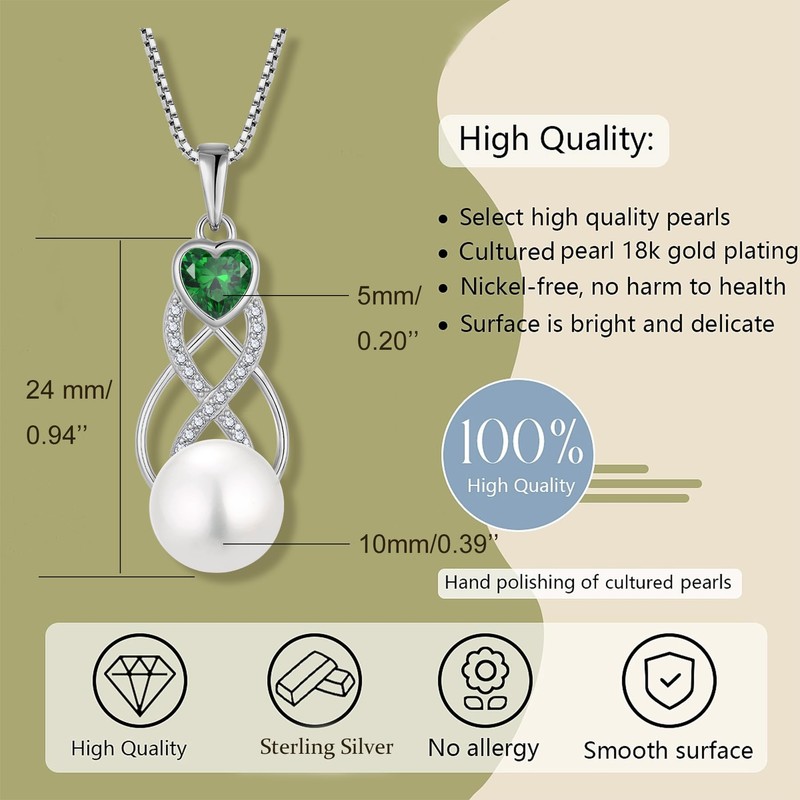 EJARY Pearl Necklaces for Women Freshwater Pearls Jewelry 925 Sterling Silver Infinity Heart May Birthstone Emerald Pendant Necklace Jewellry