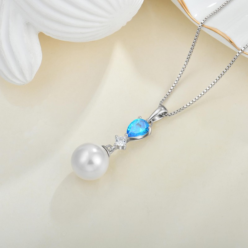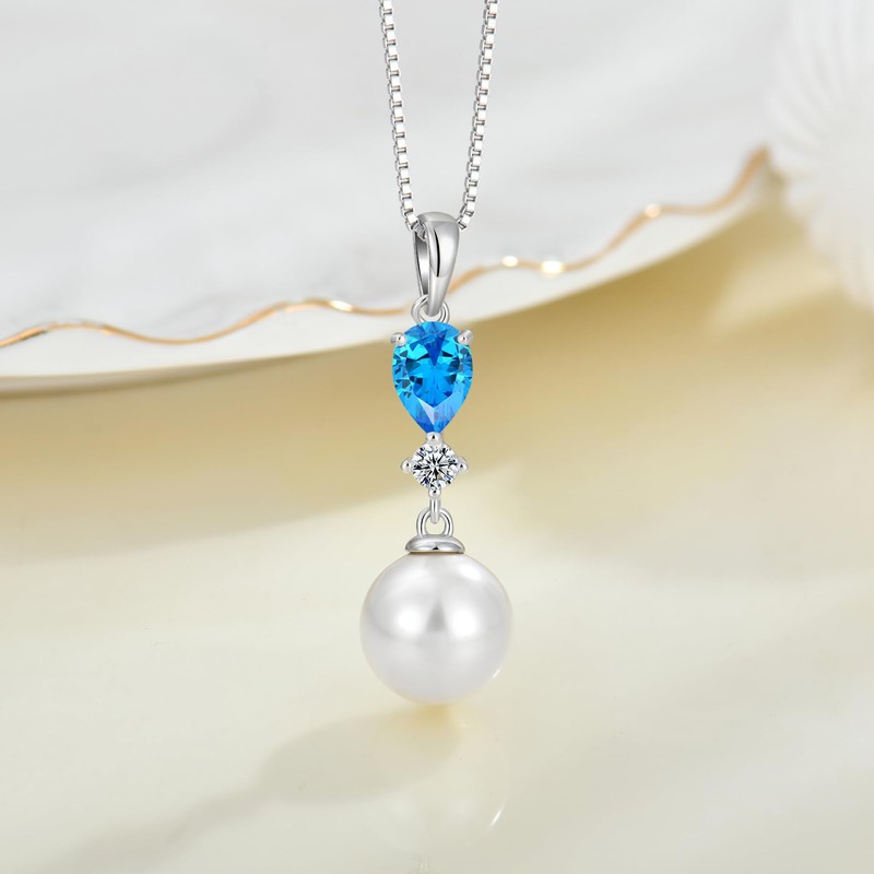 EJARY Pearl Necklaces for Women March Birthstone Aquamarine Pendant Necklace 925 Sterling Silver Pearl Jewelry
