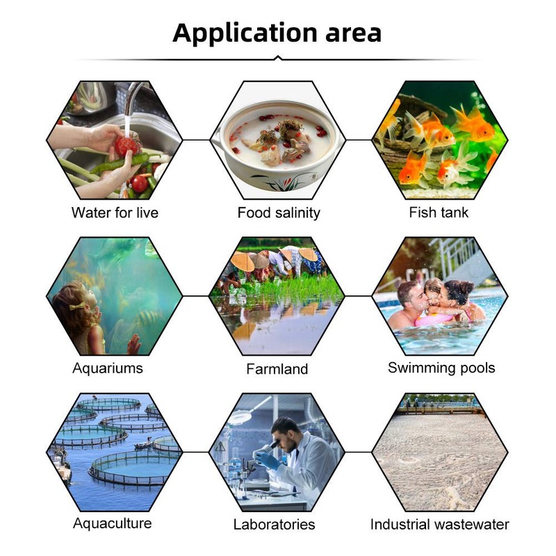 • Wide range of applications: salt content meter for measuring drinking water, reverse osmosis systems, spas, soap mixes, food, wine, beer or other liquids; widely used in swimming pools, aquariums, reverse osmosis systems, spas or hydroponics