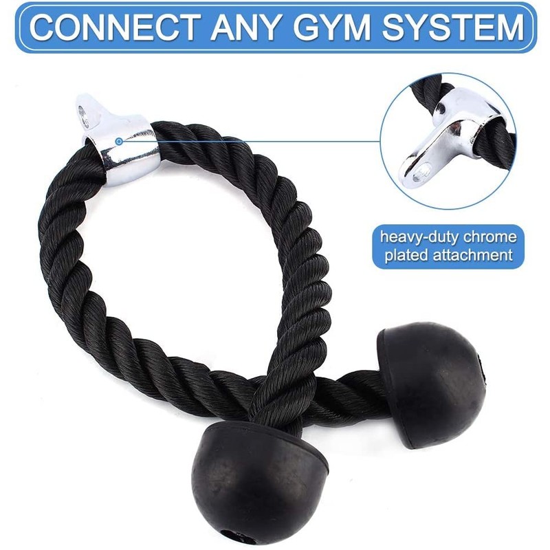 - Universal design: the triceps rope is made of durable nylon rope, rubber head and carbon steel. The tricep pull rope comes with a heavy-duty chrome plated attachment that connects to any universal multi-workout training system
