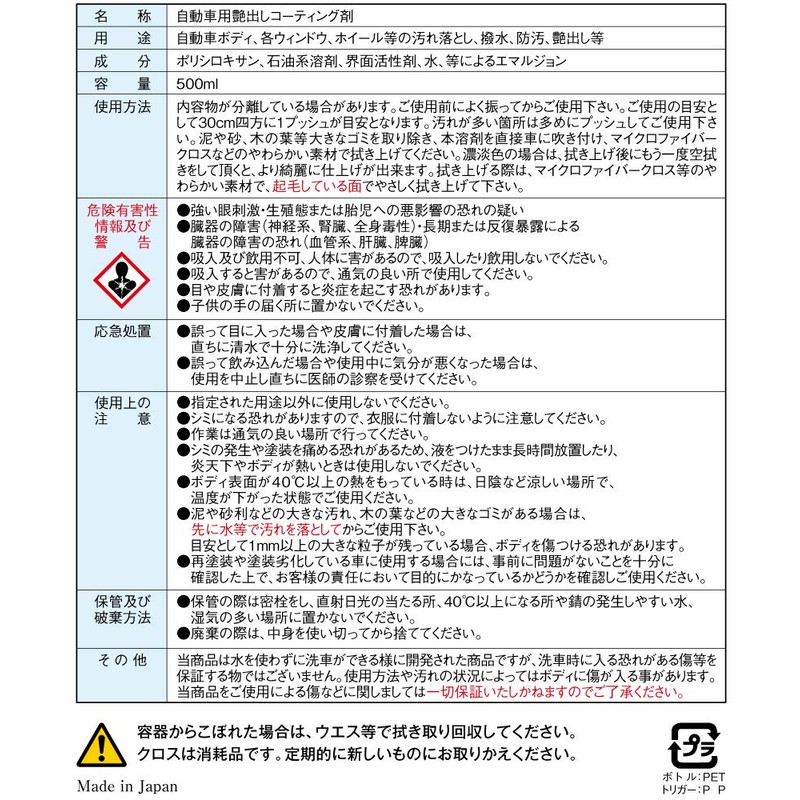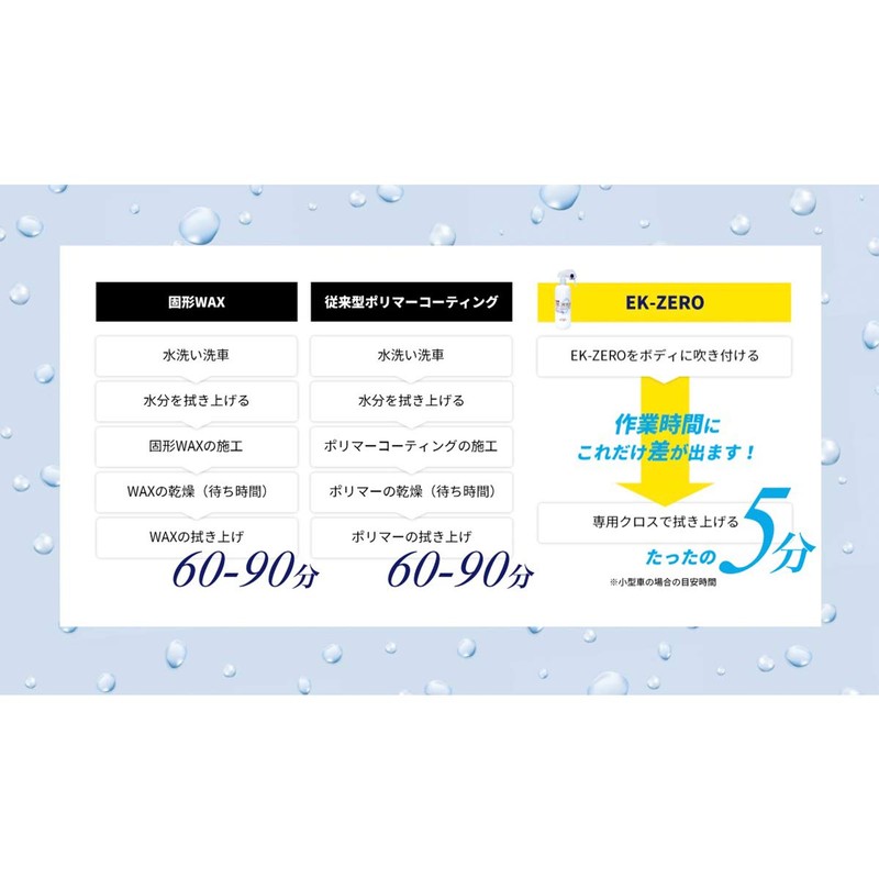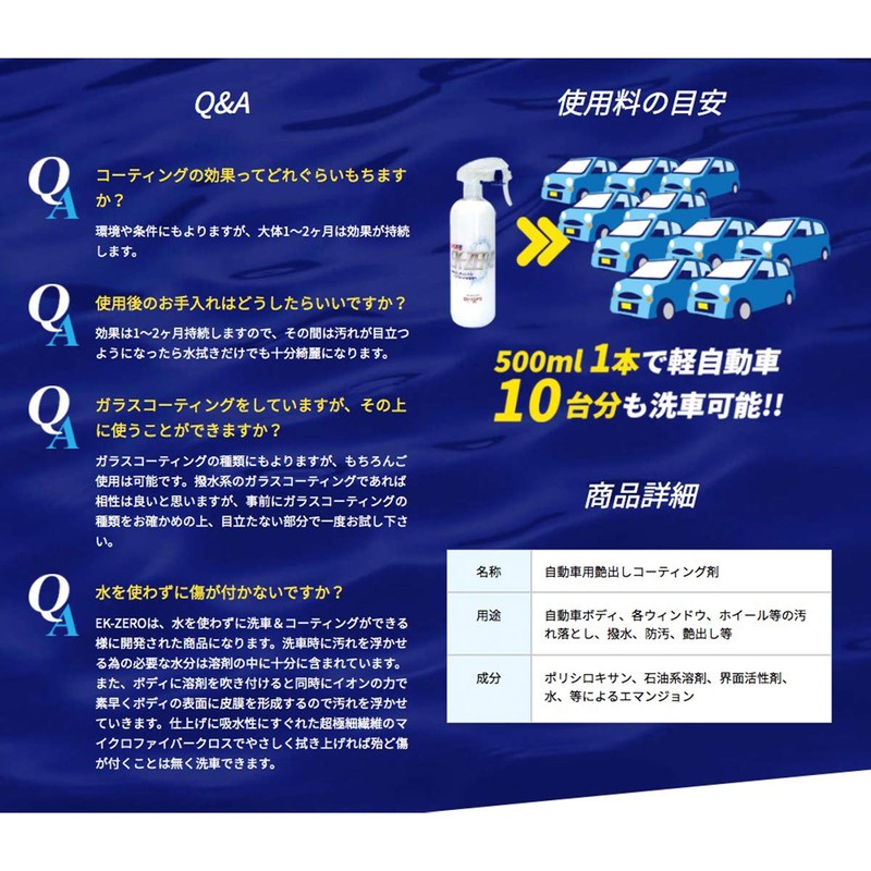 - No need to wax anymore. EK-ZERO revolutionizes your car! With this single product, you can easily wash your car without water! Polymer processing! With this EK-ZERO, you'll never need another car wash supplies again, protecting your wallet and saving your car wash time and making it easy to use. Made of a water-resistant polymer component that protects the paint film and provides a water-repellent coating