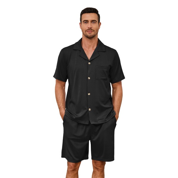 EK4YDNDS Men Pajama Set, Button up Sleepwear Short Sleeve Pjs Soft Lapel Loungewear with Pockets, Black, XL