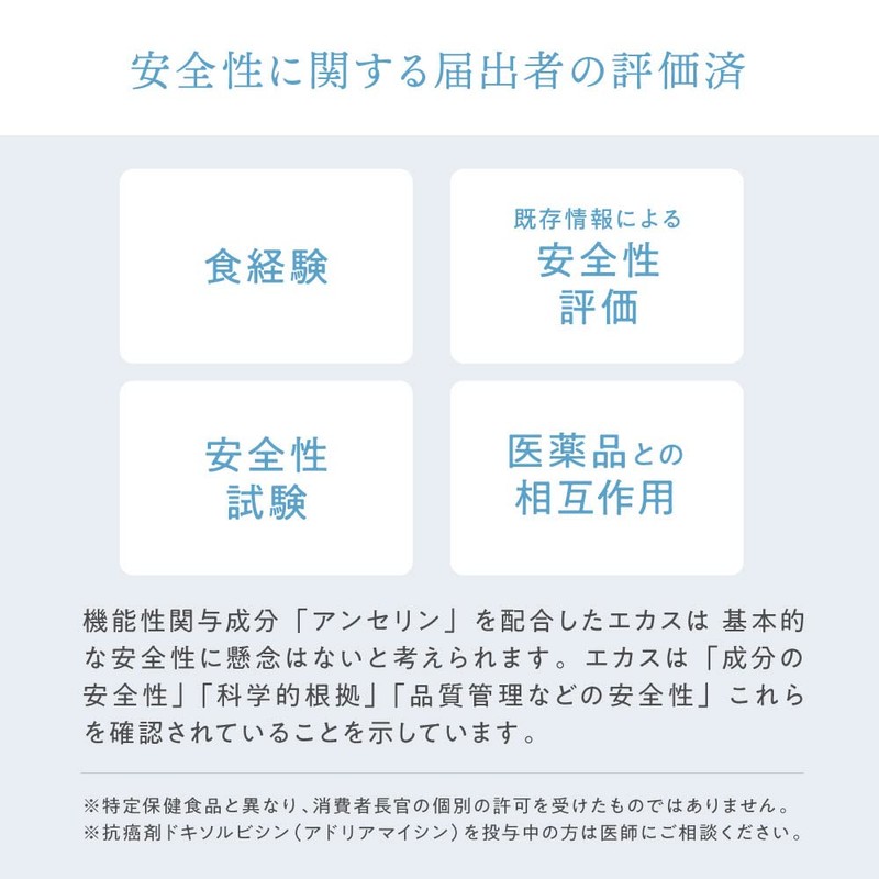 - 機能性関与成分としてアンセリンを配合することで、従来の飲み過ぎ対策に加えて「血清尿酸値が高め(尿酸値5.5~7.0mg/dL)の方の尿酸値を下げる」機能性表示食品として、新商品「エカス(機能性表示食品)タブレット:粒タイプ」へパッケージもコンパクトにリニューアル。