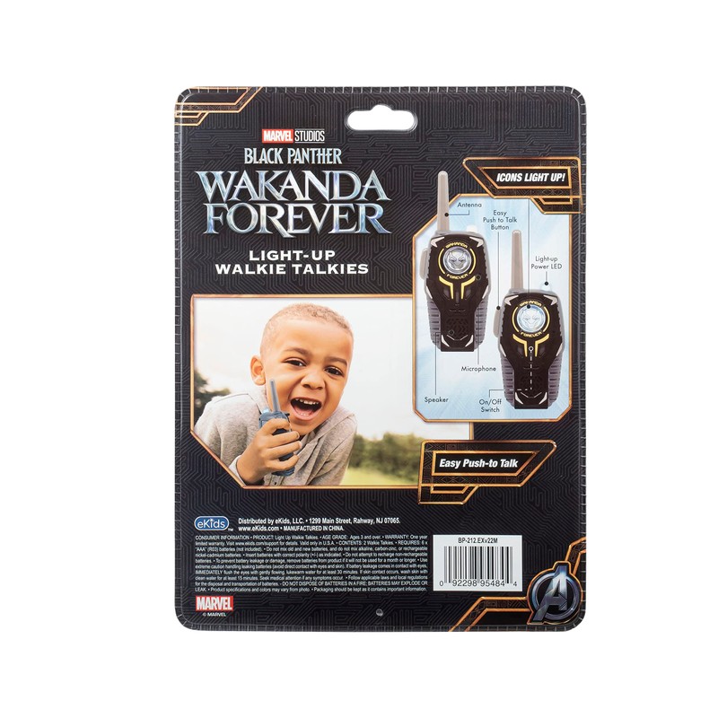 - Walkie Talkies for Kids: Two way radios feature kid-friendly, easy to use controls. These Black Panther toys have cool graphics that light up while you play indoor or outdoor games together.