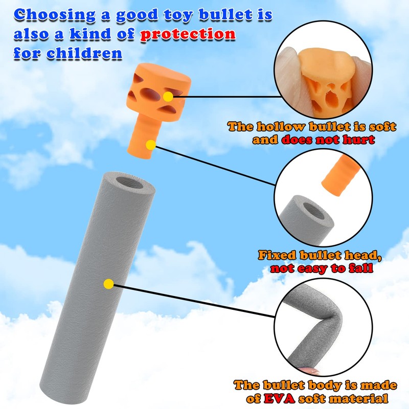 2. La cabeza de cada bala está hecha de plástico blando hueco, así que es un poco dura, por favor no disparen a las personas directamente para evitar heridas, especialmente no apunten a la cara, para prevenir lesiones en el ojo.