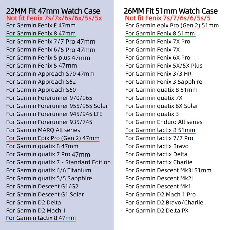 • 26 Watch Bands Compatible devicesfor Garmin Fenix 7X Sapphire Solar / Fenix 7X Solar, Tactix 7 Pro, Fenix 6X Pro / Fenix 6X Sapphire Solar, Fenix 5X /5X Plus, Fenix 3/Fenix 3 HR, --D2 Charlie/D2 Delta PX, --Enduro / Enduro 2, --Descent Mk1 / Descent Mk2i / Descent Mk2 , --Tactix Delta / Tactix Charlie / Tactix Bravo, Quatix 3. --Please check your original watch band whether mark '26' , if yes, the watch band fit for Garmin watch. ONLY Watch Band, Watch not included.