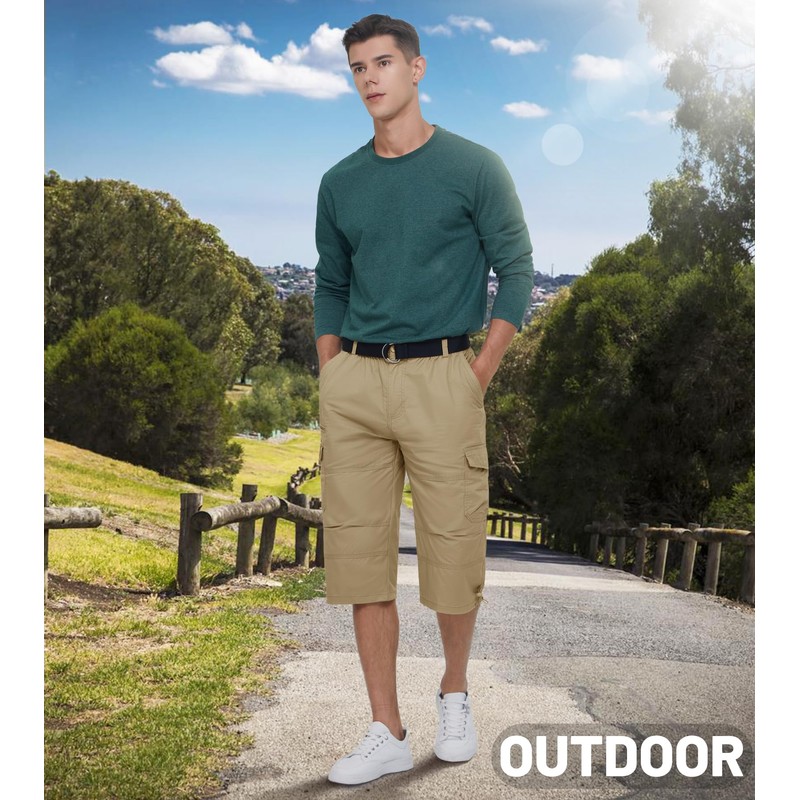 EKLENTSON Long Cargo Shorts for Men Elastic 3/4 Capri Pants Relaxed Fit Below Knee Shorts with Multi Pockets Quick Dry Work Shorts Khaki 36