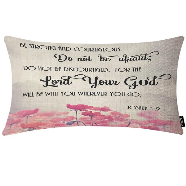 EKOBLA Christian Bible Verses Lumbar Decorative Throw Cushion Cover Scripture Quotes Joshua 19 Poppies Farmhouse Waist Oblong Throw Pillowcase for Sofa Couch Bed Home Car Cotton Linen 12x20 Inches