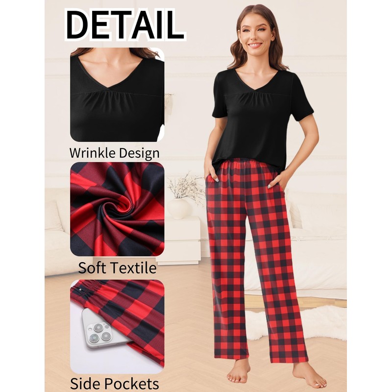 - 【Unique Design】Soft t Short sleeve pajama tops feature with a V-Neck,Wrinkles design in the middle,pullover floral print or solid style; Long pants with 2 side pockets featured relaxed fit,elastic waist,printed pants designs in classic and versatile or plaid; Diverse choices depending on your needs