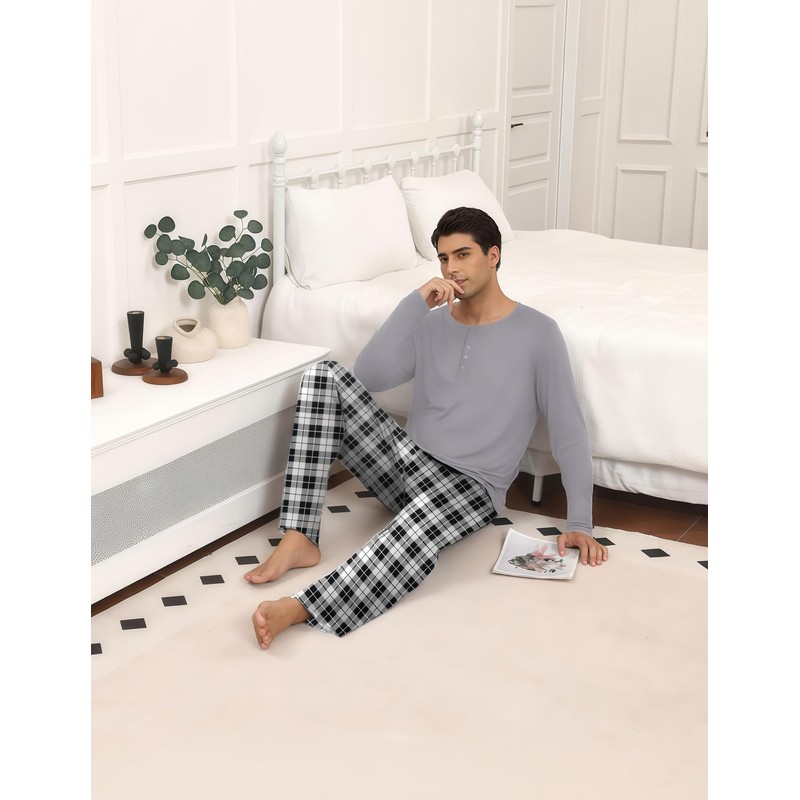 Ekouaer Men's Pyjamas Sets Long Sleeve Pjs Soft Loungewear Winter Henley Top with Checked Pants Light Grey S