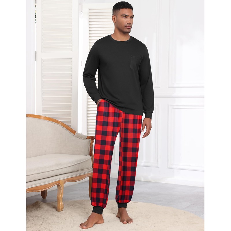 Ekouaer Mens Long Pjs Men Pyjamas Set Long Sleeve Pijamas 2 Piece Nightwear Set Loungewear, Black + Red Check, XL