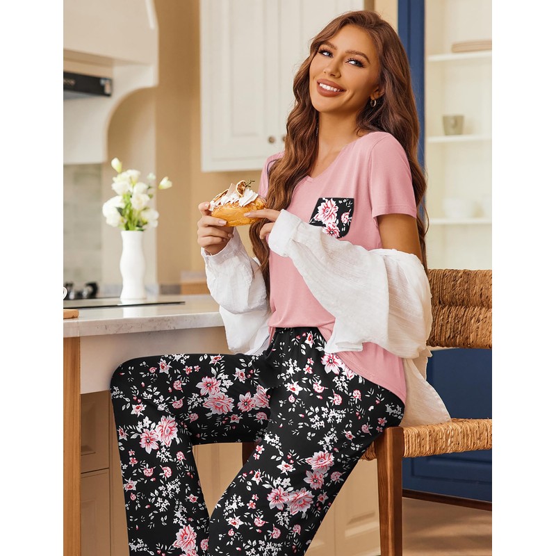 Ekouaer Pajama Sets for Women 2 Piece Short Sleeve Pj Sets With Long Printed Pants Sleepwear Casual Lounge Sets Pink-black flower M