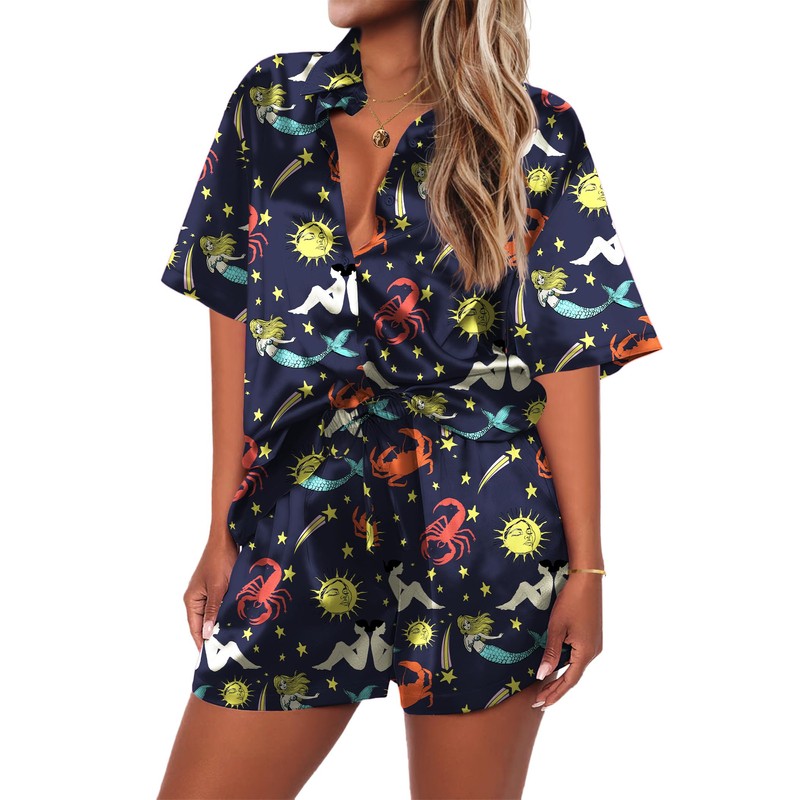 - Top:Short sleeve sleepwear,button down closure,lapel collared shirt and one chest pocket.Lightweight and Skin-friendly satin pajamas for women.This pajama top can be worn as a casual button blouse shirt, pair with jeans, trouser, shorts, or as beach shirt.So practical and comfort