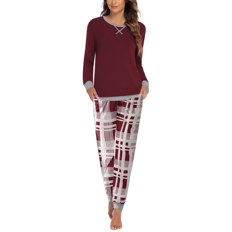 - DESIGN&FEATURES: PAJAMAS TOP-Simple long sleeve O neck pullover. PJS BOTTOMS: Long plaid pants with a drawstring waist, 2 pockets on sides. Popular designs make your family wander more comfortable and elegant.