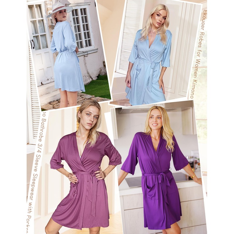 Ekouaer Robes for Women Knee Length Kimono Bathrobe Lightweight 3/4 Sleeve Sleepwear soft Loungewear with Pockets, Light Blue, XX-Large