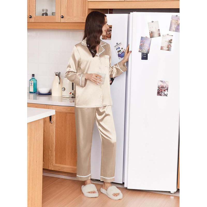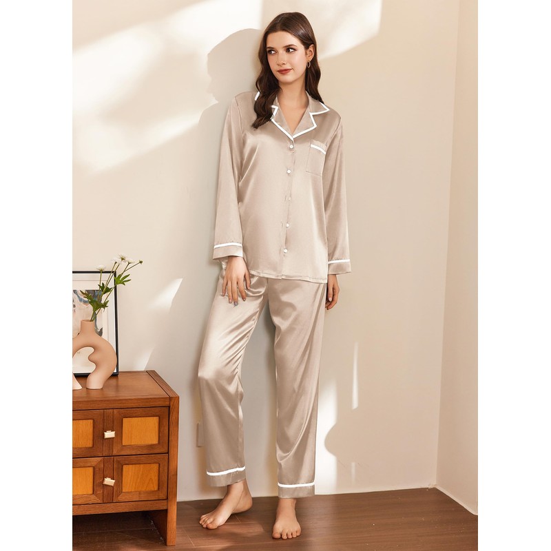 • [FEATURES] Our silk sleepwear features a relaxed fit, offering ample freedom of movement. The cozy lounge set boasts a classic button-up design, notch collar, chest pocket, and elegant contrast-colored braided trim, blending sophistication with a touch of avant-garde style. The elastic waist pants are not too tight and easy to put on, ensuring a lazy and comfortable sleep