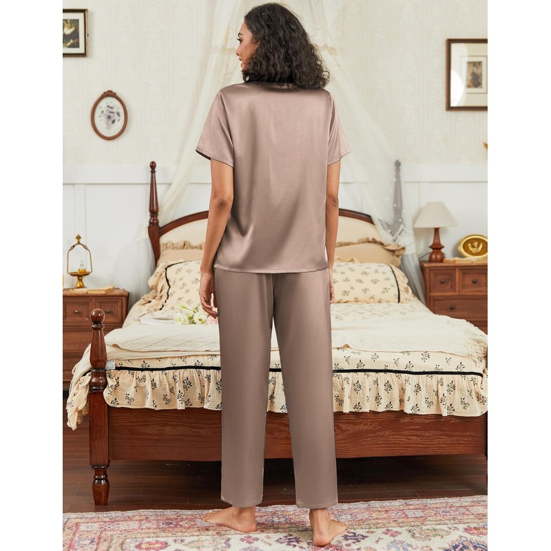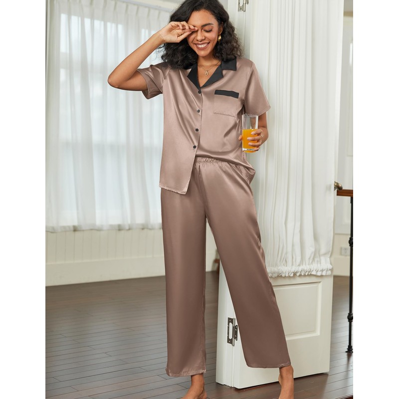 Ekouaer Satin Pajamas Set for Women Silk Button Down Sleepwear Short Sleeve Loungewear 2 Pieces Nightwear Brown