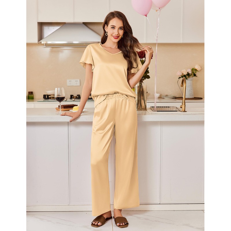 - DESIGN: Silk pjs feature the slouchy, ruffle sleeve satin T-shirt pairs perfectly with the long pants that feature elastic on the waistband for a stay-put fit.the most fashionable and comfortable satin pj sets so you can focus on being your most fabulous self
